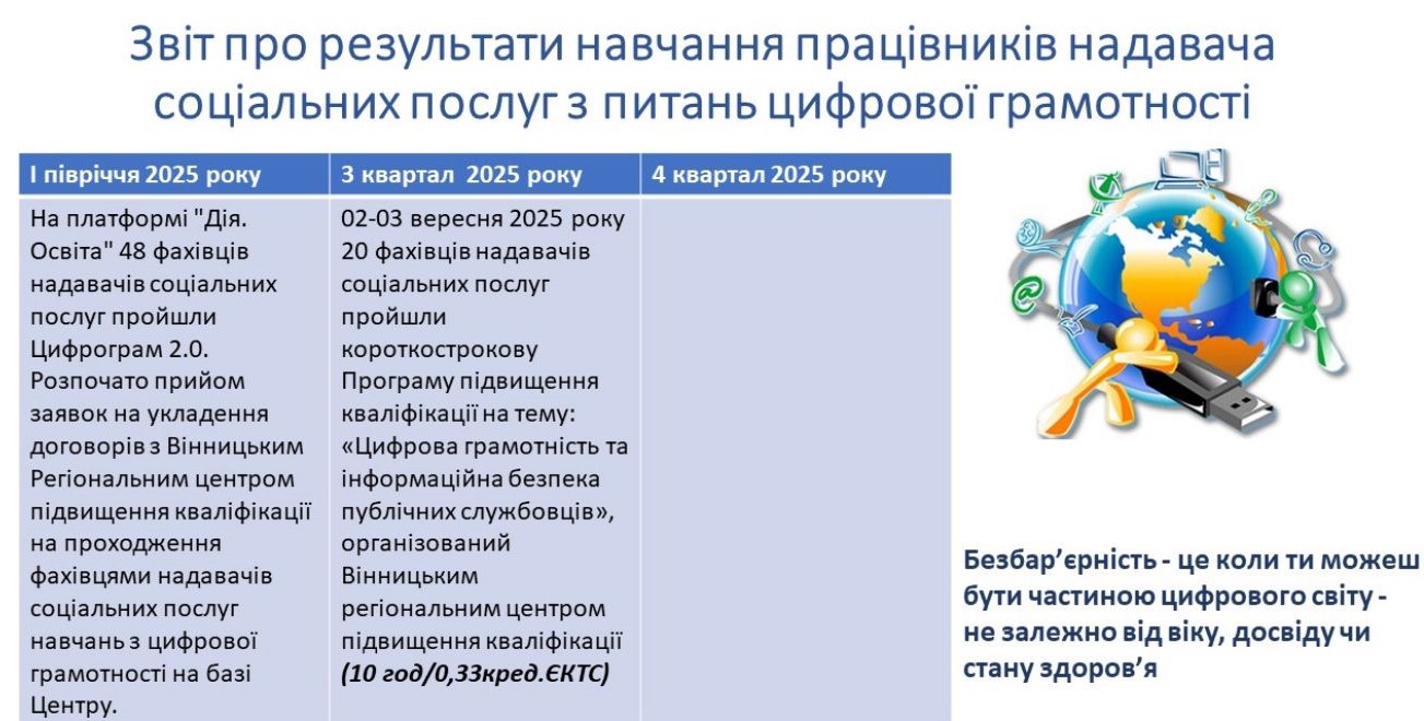 Важливо! Проведення навчання працівників надавачів соціальних послуг з питань цифрової грамотності включено до плану заходів на 2025-2026 роки з реалізації Національної стратегії із створення безбар’єрного простору в Україні на період до 2030 року, затвердженого розпорядженням КМУ від 25 березня 2025 року № 374-року, Стратегічна ціль «Усі громадяни мають доступ до електронних публічних послуг з питань цифрової грамотності».