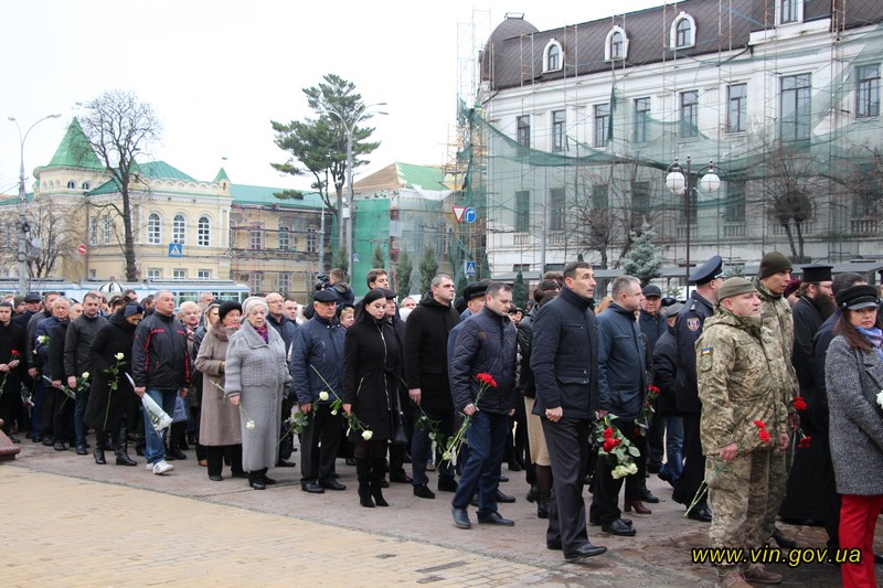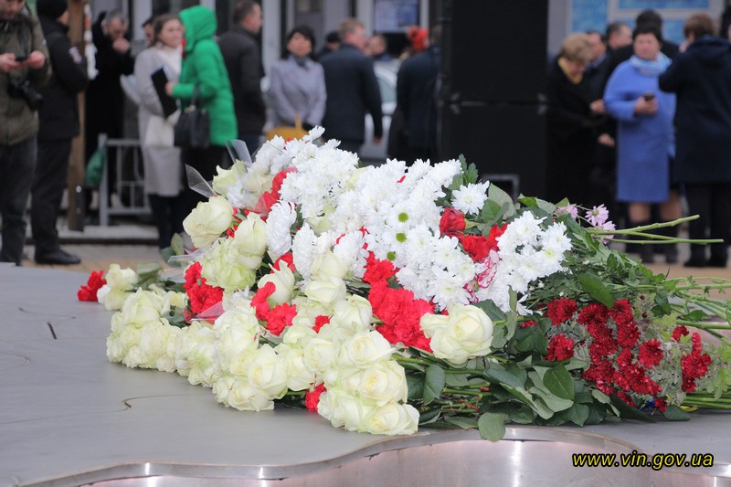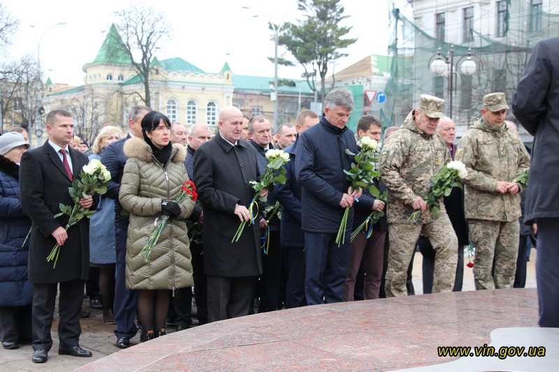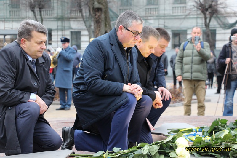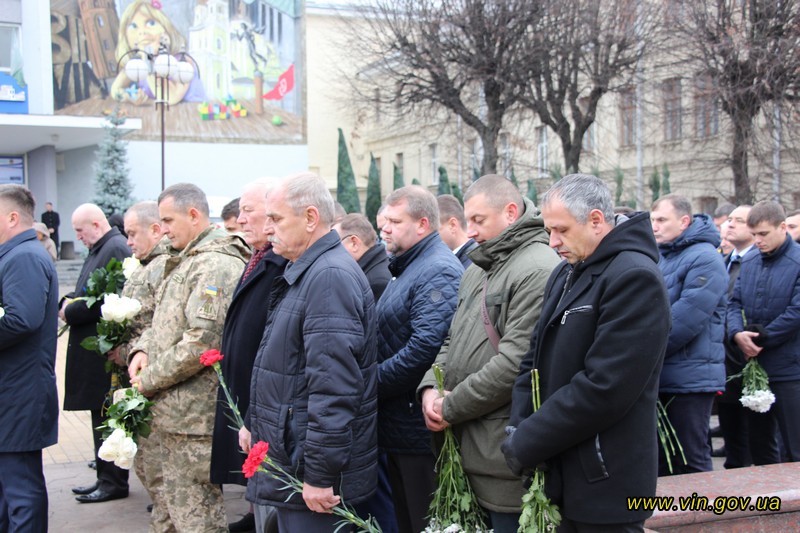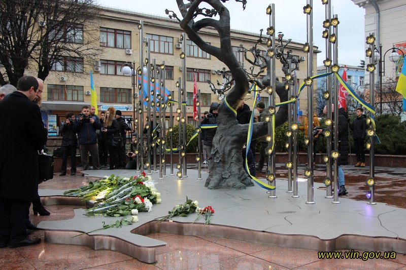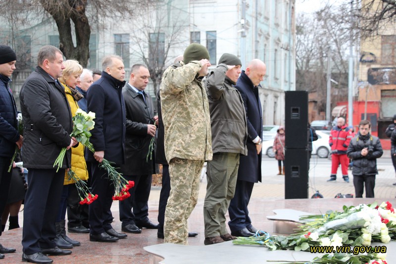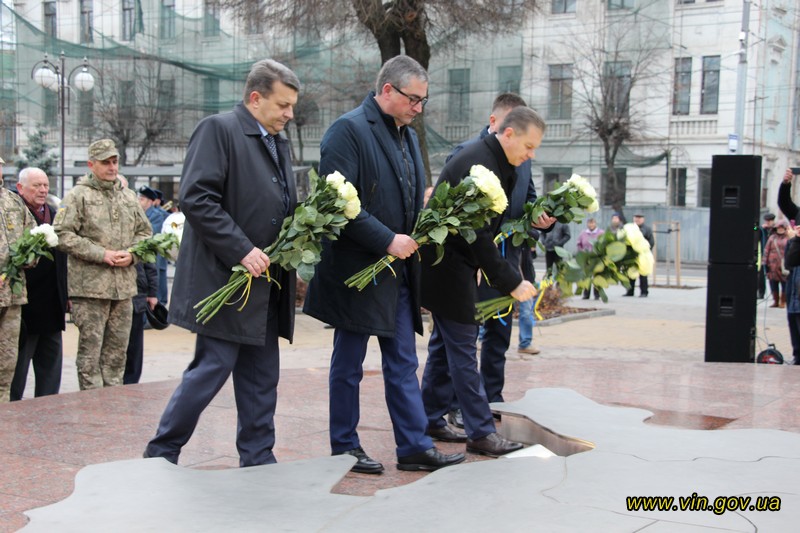 Голова обласної державної адміністрації Владислав Скальський, голова обласної ради Анатолій Олійник, Вінницький міський голова Сергій Моргунов, керівники структурних підрозділів обласної та міської влади, закладів, установ та організацій хвилиною мовчання вшанували пам`ять загиблих на Майдані, поклали квіткові композиції до пам`ятника «Дерево свободи», а також делегували учасників заходу покласти квіткові гірлянди до пам`ятників Героям Майдану та героям АТО /ООС, що на Меморіалі слави.