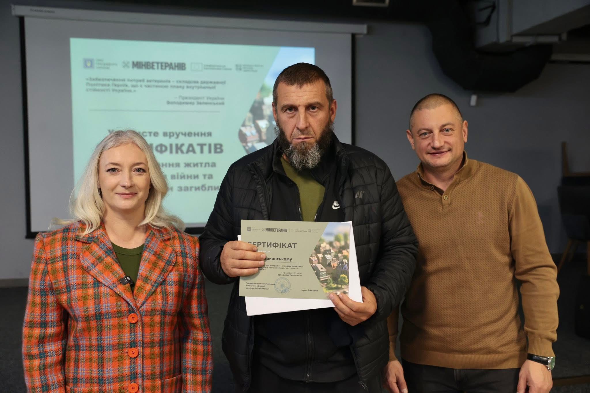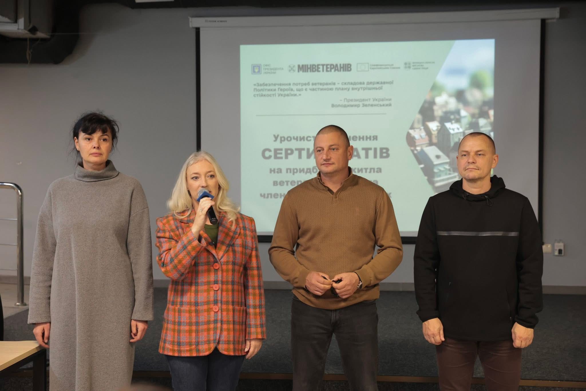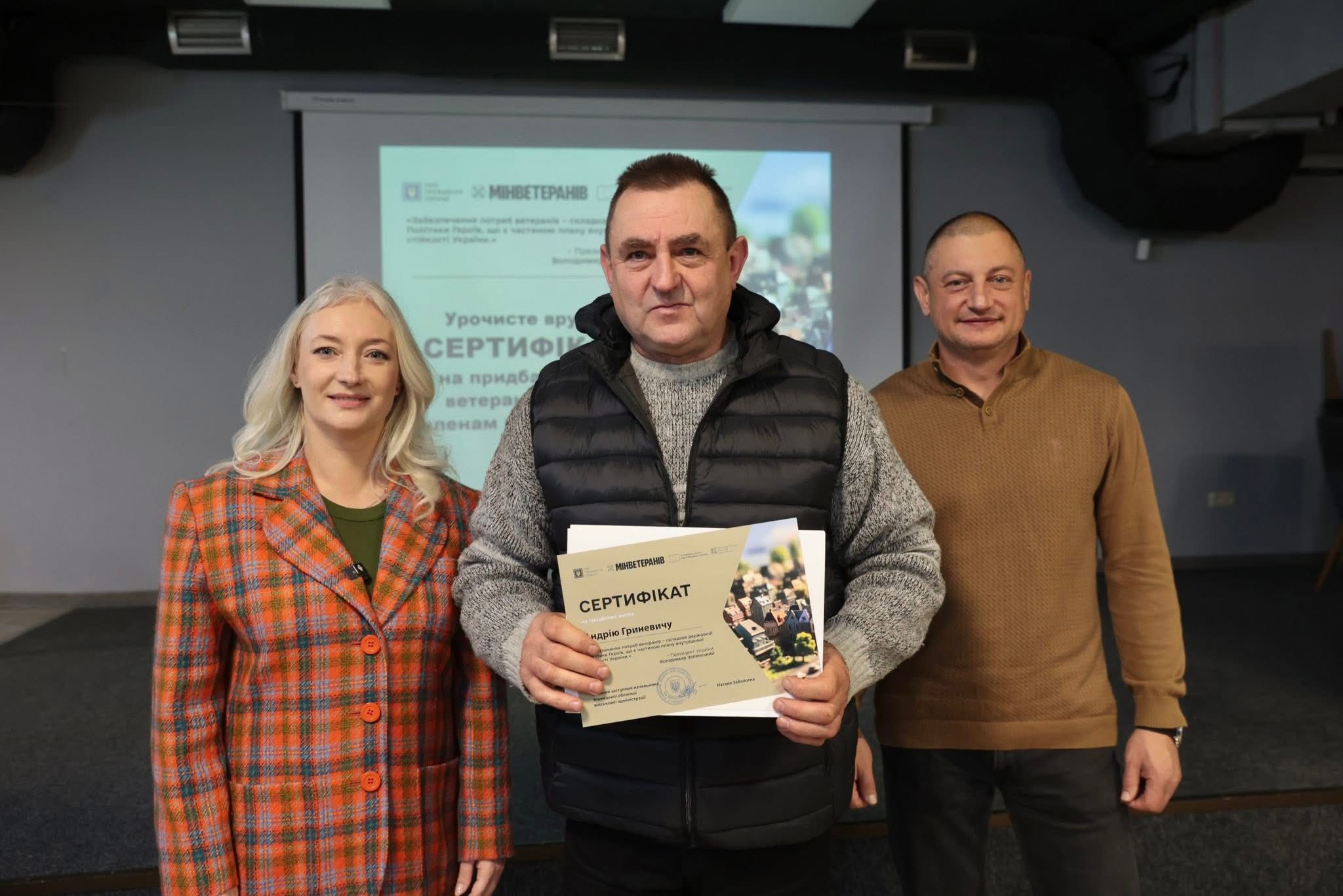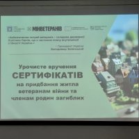 Перша заступниця начальника ОВА Наталя Заболотна вручила сертифікати на придбання житла ветеранам війни та членам родин загиблих. До заходу також долучився директор Департаменту ветеранської політики ОВА Андрій Грачов.