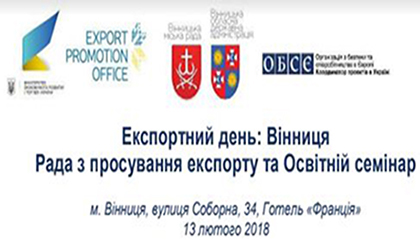 Вінницька обласна державна адміністрація запрошує підприємства усіх форм власності 13 лютого 2018 року долучитись до участі в "Експортному дні", де будуть напрацьовані конкретні рішення проблемних питань щодо розвитку експортного потенціалу та обговорені можливості для українського бізнесу.