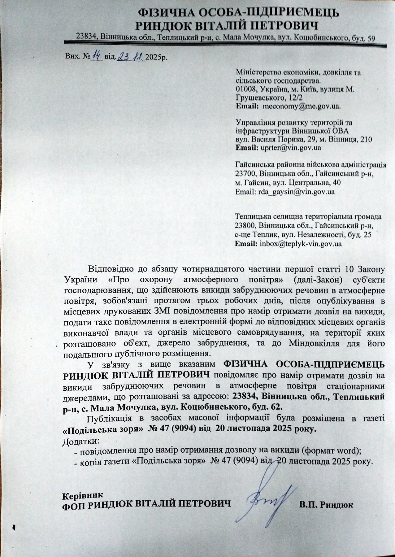 Місцезнаходження суб’єкта господарювання -23834, Вінницька обл., Гайсинський р-н, Теплицька ТГ, с. Мала Мочулка, вул. Коцюбинського, буд. 59, контактний номер телефону – 0682768207, адреса електронної пошти суб’єкта господарювання-